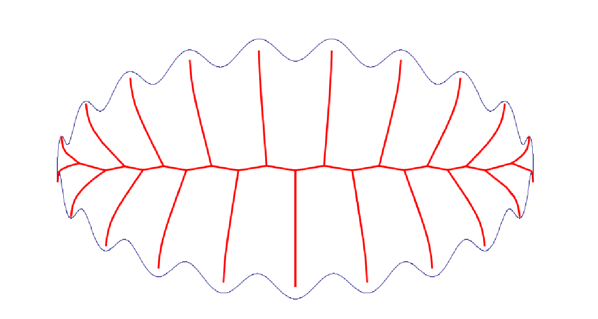 Complex shapes — the algorithm was also tested on a highly oscillated curve (20 waves around an ellipse), first showing the raw discrete sample points, then the fully traced skeleton: